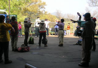 | ケーブルカーで上がり、高尾山駅で準備運動 |