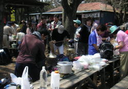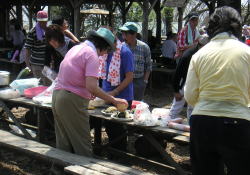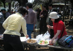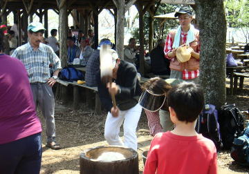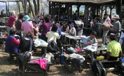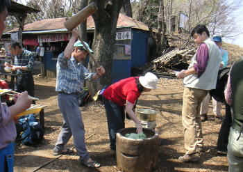| 景信山に着くと、さっそく調理と餅つき。この段階では手が出せずただ見守るだけの人も。準備をされた方、調理をされた方、餅つきをされた方、ありがとう。 |