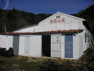 | 赤石山荘は白く塗られた小屋でとてもきれいだ。小屋の外には80Lを越えるような大きなザックが5,6個あり、長期の縦走をしているパーティーが泊まっているようだった。小屋の前に立っても起きている気配がないので、起こしては悪いと思い中をのぞくのは止めにした。 小屋の前から見る東赤石山から西に延びる岩尾根の景観は素晴らしい。計画では小屋から東に進んで東赤石山へ行く無難なコースを取るものだったが、岩の尾根を眺めているうちに歩いてみたくなった。2.5万図を見ると尾根に道がついている。よし行こう。 |