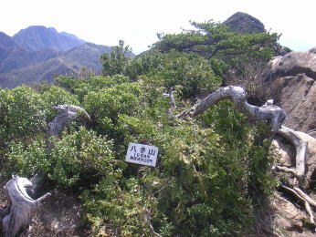 | 小屋から西赤石山の方に行く道を辿ると15分ほどで尾根に着いた。東赤石山に行く方の案内板には悪路と書いてある。進むと赤布やペイントはなく踏み跡だけが頼りだ。岩場なので踏み跡がついていないところもあり、どちらに行ったらいいのか分からなくて困ったところもあったが40分程で岩尾根の中間にある八巻山に着いた。八巻山には山荘から直接登る人や東赤石山の方から登る人がいるらしく、ここまで来ると踏み跡もしっかりしており、赤布もあった。また全く必要とは思えないところに2段ほどの梯子もあった。 |