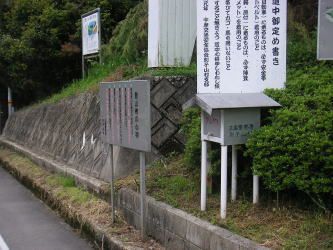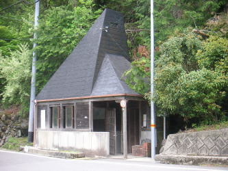 | 筏津の登山口と近くにあるバス停。待合室はとても立派で避難小屋としても使えそう。 |
