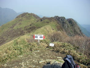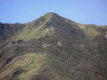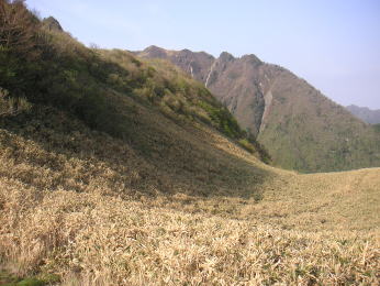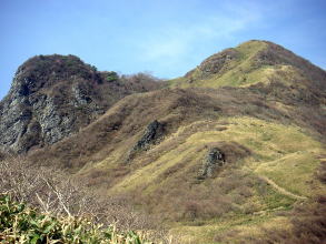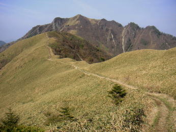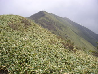 | まず伊予富士に向かう。笹原につけられた道を辿り小さなピークをいくつか越えると、広い笹原の尾根の向こうに伊予富士がよく見える。笹原につけられた道を進んでゆくと、伊予富士の最高点のあるピークの上部の30mくらいの部分が富士山のような形をしているのに気付いた。まさかこれが伊予富士という名の由来ではないだろうが、もしかしたらそうかもしれないと思った。 |