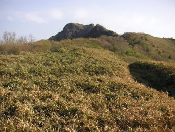| 6時に旧寒風山トンネルの入口にある登山口を出発し、1時間ほどで桑瀬峠に着いた。峠は広々とした笹原で、寒風山の岩峰と伊予富士が見える。しかし伊予富士の姿はどう見ても富士というイメージではない。いくつかのピークの集合体で左端のピークはゴツゴツした岩峰である。地図で確認してもこれが伊予富士であることは間違いない。 |
