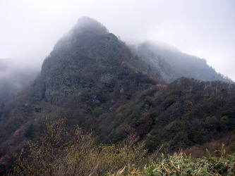 | 寒風山への登りは急で、岩場のそばを通るが登山道は岩場を歩くようにはなっていない。ガスで岩場が霞んで見えたため、なおさら険峻な山を歩いているような感じを持てて良かったのかもしれない。 |