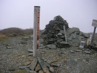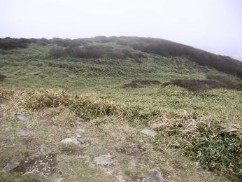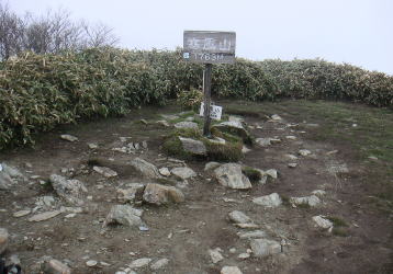 | 山頂が近くなると道の傾斜が強くなり、左端の岩峰が下に見えるようになればすぐに頂上だ。山頂が近づくと笹原は灌木帯に変わるが、眺望を遮るほど高い木はなく周囲の景色がとてもよく見える。 同じ道を桑瀬峠に戻ったが、初めはよく見えた寒風山や笹ヶ峰がガスが出てきてだんだんと見えにくくなってきた。桑瀬峠に戻ったときには寒風山も霞んでいた。 |