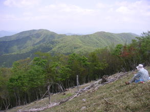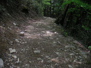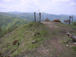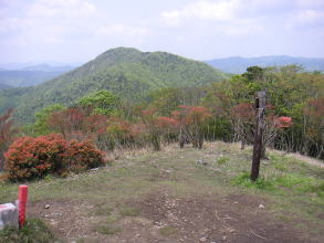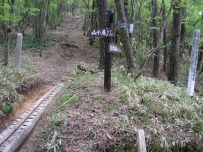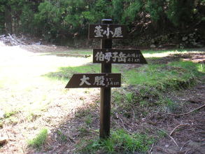 | 30分ほどで萱小屋(跡)に着くが、道幅は広いままでいっこうに山道らしくならない。軽自動車なら通れそうな広さだ。この後もこの広い道は続き、結局山頂から300m位の護摩壇山への分岐まで続いていた。 |