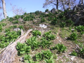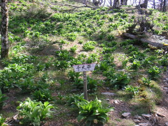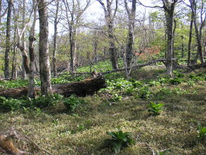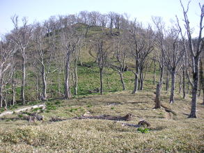 | さらに進むとコバイケイソウの緑が目につく。ササと競っているかのようにコバイケイソウの大群落が続く。斜面の大部分を覆い尽くしているところもある。ササはまだ新芽が出ていないので緑というよりは全体としては白に近い茶色に見えるので、いっそうコバイケイソウの緑が目立つ。一斉に花が咲くときにはみごとだろう。ササとの競争にコバイケイソウが勝てるなんて思っても見なかったが、ここで見る限りササに勝っているように見える。ここのササの背丈がとても小さいためなのかもしれない。また立ち枯れの木が多く、コバイケイソウとササと共に特徴のある景観を作っていた。 |