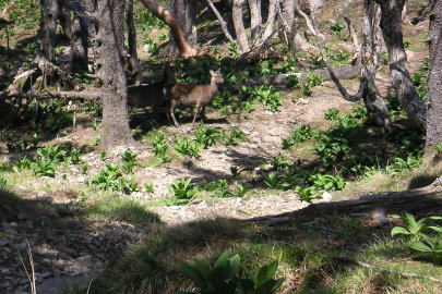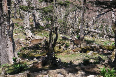 | 帰路、千丈平付近で10頭くらいのシカの群れに出会った。立ち止まって周囲をうかがうようなそぶりを見せるものもいて野生のシカならではの行動のようだった。私たちは警戒の対象にはなっていないらしく、近くにいたにもかかわらずゆっくりと移動していった。丹沢などで見かけるシカはたいてい群れをつくっておらず、動物園のシカのようだ。 |