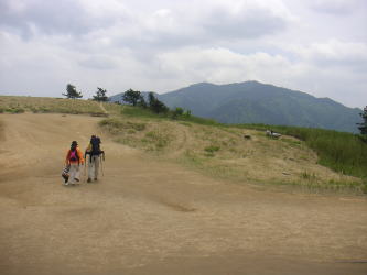 | 山頂は神社付近のうっそうとした森といった雰囲気とは全く違い、広くて木のない草地または草も生えていない地面で運動公園のようだった。 往路を戻り、今夜の宿のある琵琶湖に向かう。 |