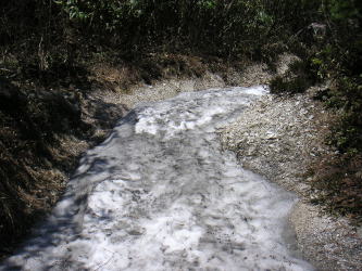 | 登山口付近の平坦な道にあった雪。30℃くらいの気温で強い陽ざしの中こんな所にも雪が残っていると、さすが北海道は違うと感激。 |