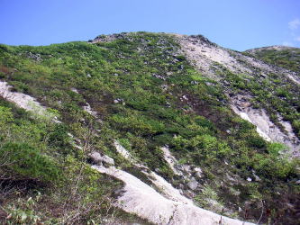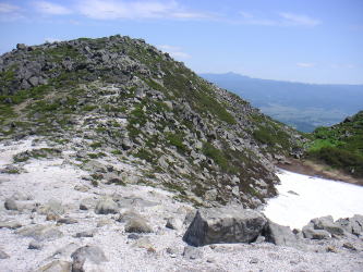 | 大沼へのコースとの分岐点付近からはイワオヌプリに続く尾根の肩が見える。岩の尾根が続いていて高山の雰囲気。 |