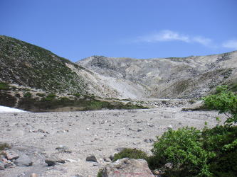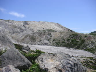 | イワオヌプリ。噴火で火口壁の一部が吹き飛んでしまい、尾根のようなかたちで残った部分を辿るように登る火山活動の激しさを感じさせる山だ。登山コースの大部分は砂礫かガレで、景観も素晴らしい。 |