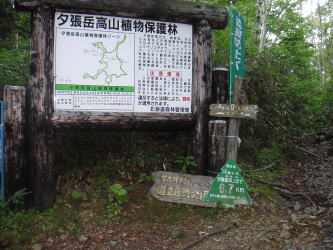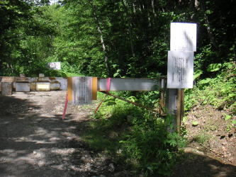 | 前日、夕張岳ヒュッテを目指して林道を走って行くと、閉鎖されたゲートで行き止まりになってしまった。『この先、夕張岳登山道に至る鹿島林道は、大雨等により一部林道が決壊しているため、安全管理上、通行禁止いたしますのでご了承願います。』と書いてある。夕張岳ヒュッテまで9kmとも書いてあった。9kmを往復すれば平坦な道でも4時間はかかるので、全体では12時間以上かかることになる。でもせっかくここまで来たのだし、12時間くらいなら日帰りできるので林道の閉鎖にめげず登ることにする。 |