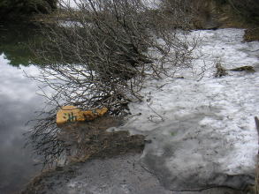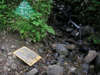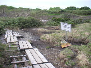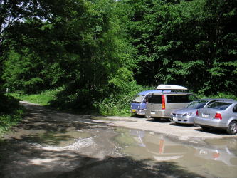 | ゲートから40分ほど歩いて、これで林道の3分の1くらいは歩いたかななどと考えていると後ろから車の音がする。閉鎖されているのでどういう事なんだろうと訝っていると、間もなく軽トラックが来て止まり、乗って行かないかと誘っていただいた。自然保護監視員のパトロール車で、聞くとゲートの鍵を持っており、軽自動車なら‘決壊’したところを通れるので車を使って登山口まで行き、夕張岳の監視に行くところだった。渡りに船と乗せていただき、お陰で登山口まで2時間はかかると思っていたところを1時間で到着できた。 |