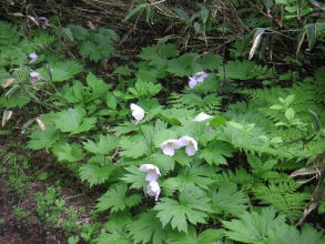 | 石原平のシラネアオイの群生。色が薄いのが特徴。三分の一くらいは白花。 |
