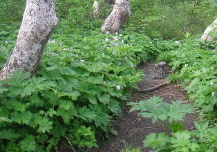 | 石原平のシラネアオイはたくさんあって見応えがあった。他の花もたくさんあり写真を撮るのに忙しいくらいだった。望岳台から先の登山道は高原の遊歩道といった感じでありながら雪渓、雪田、池、草原などと変化に富み楽しい。 |