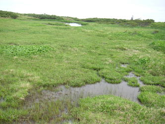 | 山頂近くの眺望。ひらけた草原で、花もたくさん咲いている。 |