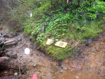 | ガスがかかり小雨が降ったり止んだりの状態だったので、山頂での眺望はなく、山名のプレートの写真を撮って直ぐに戻る。山頂付近の岩場には花があったが雨と風と暗さでとても写真の撮れる状況ではなかった。 登るときに林道終点の近くに簡単に沢に下りられる所があるのを見て、帰りにはそこで雨具やスパッツ、靴などを洗うつもりでいた。でも見逃して林道まで下りてしまったが、戻って洗った。山めぐりをやっていると、靴は毎日のように使うので汚れていればできるだけ早く洗うことにしている。このための専用のブラシを常に持ち歩いている。 雨に降られ、大きな段差のあるヌルヌルと滑りやすい泥の道が一番印象に残った斜里岳だった。 |