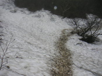 | 小屋の脇の道を少し進むと車道に下りてしまい、しばらくは車道を歩く。車道の終点にはトイレがあり、ここが実質的な登山口だ。 ここからは沢沿いの道で、新旧の登山道が分岐する二股までに10回ほど渡渉したが雨で増水しているようすはなく、水には入らずにすんだ。沢を埋めた雪の上を歩くところもあった。 |
