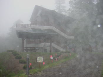 | 清岳荘は、前の駐車場から見上げると大分大きく、面白そうな形の建物のようだがガスがかかっていて全貌はよく見えない。入山届けを出すためドアを開けると強い木の香がする。内装全体が真新しい白木だ。ごく最近に建てられたようだ。 |