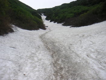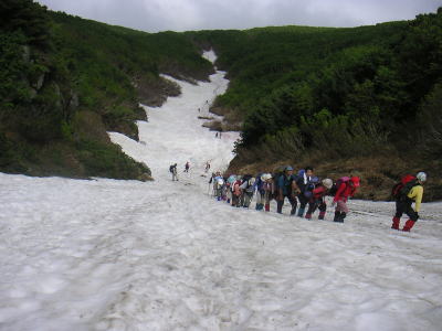 | 雪渓も多くの人が登っていて、ステップもしっかりしたものになり階段を上るような状態になっているところもあった。 このころになると雪は柔らかく、運動靴でも簡単にかかとをけり込めるのでステップを登りの人に譲っても簡単に下ることができた。 |