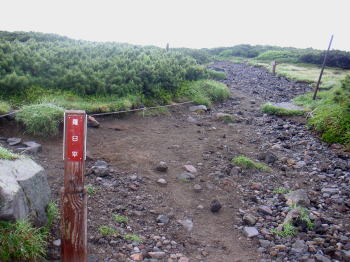| 11時には登山口に戻り、岩尾別温泉のホテル地の涯で温泉に入って汗を流してから、硫黄山の登山口に行く途中にある知床五湖に向かう。 知床五湖の駐車場の手前でカムイワッカの滝方面にゆく道路が閉鎖されているのを見る。駐車場の人に聞くと、7月13日からシャトルバスが運行されるが、現在は閉鎖されているという。13日まで待つわけにはいかないので硫黄山に登ることを断念する。 |