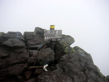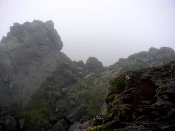 | 山頂にだけ雲がかかっている状態で展望はなかった。風を避けるため岩陰に入って20分ほど待ったがだめで、あきらめて下山。 |