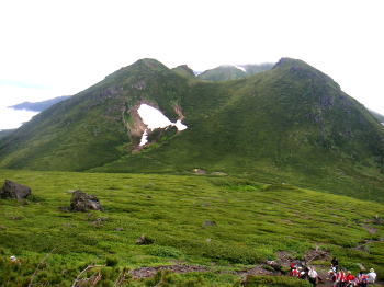 | 羅臼平に下る頃には登ってくる人が続々と。後方は三ツ峰 |