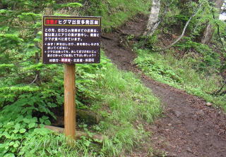 | 4時半頃出発。登山道はよく整備されていて朝露に濡れるようなところはほとんどない。このあたりはアリが多いので、掘り起こして食べるためにクマがよくやってくるので注意という看板があり、『クマ出没。注意』などというのと比べるとリアリティーがあって知床らしい。 |