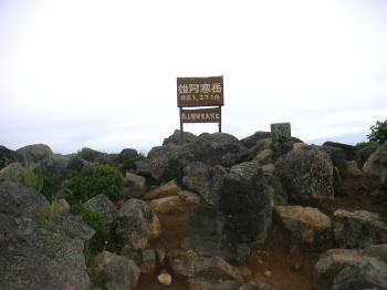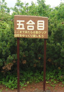 | 昼頃から雨が降り出すという予報だったので、5時20分には滝口登山口を発った。登山道には一合目、二合目、…と道標があり五合目までは一合あたり20分くらいで登れる。五合目の道標には『ここまで来たら8割クリア 自然をゆっくり楽しもう』と書いてある。五合目で8割とはどういうことかと訝りながら進むと、五合目から山頂までは一合あたり10分もかからない。これは傾斜が急に緩くなるためで、8割クリアというのは実感と合う。 |