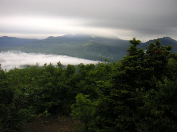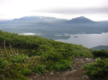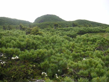 | 五合目あたりからはハイマツ帯になり尾根の道になる。眺望も開け雌阿寒岳や阿寒湖、その他の湖や池も見える。山頂に近づく頃には天気が崩れる前兆なのか風が強くなり、寒くなる。 山頂では写真を撮り早々に引き上げ、登山口に戻った。 |