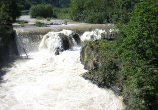 | 山岳センターのそばのピョータンの滝には、泥で濁った水が轟音を立てて流れていて、一目見て札内川を歩くのは無理だと思いました。 |