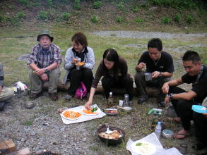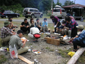 | 準備ができれば、バーベキューで宴会開始。おいしいものが次々と出て来ました。食当の皆さんご苦労様 |