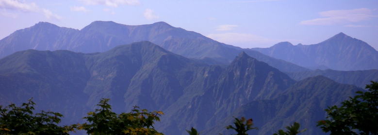 | 七合目付近から見る、左から谷川岳、一ノ倉岳、茂倉岳、右端のピークは万太郎山。手前のとがったピークが大源太山 |