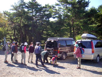| 登山口の駐車場へは車2台で。早速身支度をして出発 |