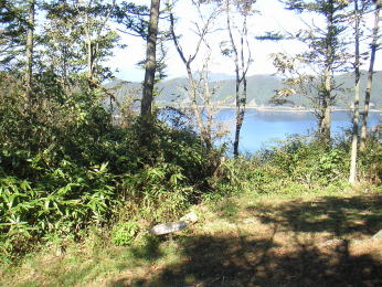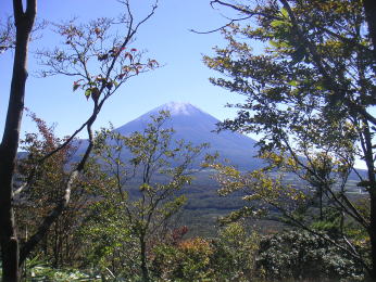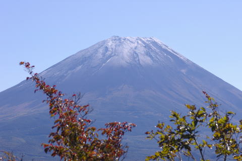 | 少し登れば、薄く雪化粧した富士山がくっきり見え、ブルーの本栖湖も見えた |