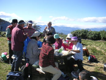 | うっすらと雪化粧した富士山がくっきりと見える晴天の下、風がなくぽかぽか陽気の山頂で豪華なサケ、タラ、白子、つみれ、エビ、ハマグリ、カキ、シラタキ、豆腐、その他豊富な野菜が何種類も入り、コッヘルからあふれそうな鍋を楽しみました。 |