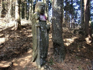 | 石地蔵まで来れば九十九曲の坂も終わり、この後しばらくは平坦な道。急に元気になって歩く速度も速くなる。 |