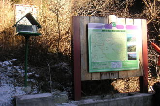 | 金山鉱泉にあるハイキングコースの案内板と登山届用ポスト。ここまでは大月駅からタクシーで。金山峠へは尾根コースと沢沿いのコースの二つがある。しばらくは林道をそのまま進む沢沿いのコースで金山峠に向かう。 |