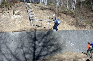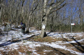 | 姥子山付近で、今度は林道を横切る。立派な土留めの石の壁と階段がある。少し先には姥子山への分岐がある。この辺りから雪があったが、少ない。 |