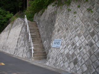 | 右折して数分歩くとこの階段があり、ここが赤抗尾根のコースの登山口。階段の上で身支度をして出発。 |