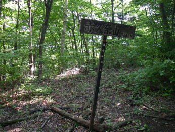 | 更に40分程歩くと赤久奈山への分岐に着く。赤久奈山まで110mとあり、行ってみる。分岐から山頂まではほぼ平坦で、山名の表示されているところも平坦で山頂らしくない。だが木を刈り払って小さな広場のようになっているが、木に囲まれて薄暗い。 |