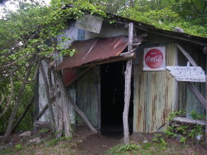 | 川乗山山頂近くの廃屋となった川苔小屋。この山では川乗と川苔が同じような割合で使われている。 |