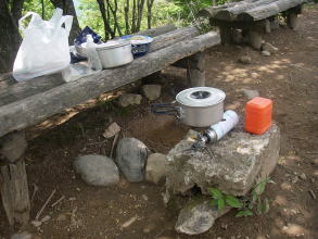 | 川乗山の山頂でお湯を沸かしてカップラーメンを食べたが、虫が多く閉口した。虫が寄ってくるのでカップ麺を持って移動しながら食べなければならない程だった。もちろん麺の中に飛び込んでくる虫もいた。 |