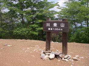 | 山頂から鳩ノ巣への分岐を経て、鋸尾根を通り大ダワに。 大ダワの道標には川乗山の南面に入る道は通行禁止と書かれた新しいシートが巻き付けてあった。そこから南面を見ると樹間に斜面に巨大な板を敷いたような地形が見える。鹿の食害により荒れた斜面の植生の再生工事をやったところのようだ。ピラミッドの面のように完全な平面に見える。植生の回復には平面の方が良いのか、あるいは工事がやりやすいのか知らないがどう見ても不自然だ。 |