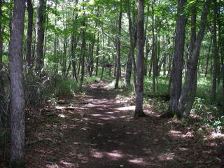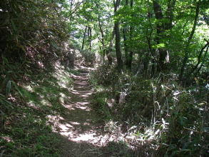 | コース全体が樹林帯にあり、道路から見上げる艫岩の異様さを感じさせるようなものは登山道には全くない。艫岩展望台から経塚山、星尾峠分岐まで約1.6q続くほぼ平らな広い登山道はまるで公園の遊歩道のようで、高いところを歩いているという実感が全くない。面白いところだ。 |