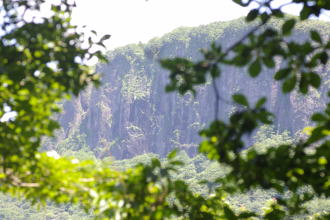| 登山道から艫岩が見えるところは少ない。枝の間からかろうじて一部が見える。 |