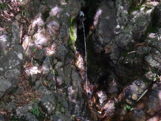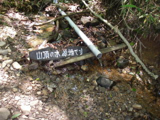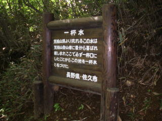 | 登山口から50分ほどの所にある一杯水。名前の由来を書いた案内がある。 |