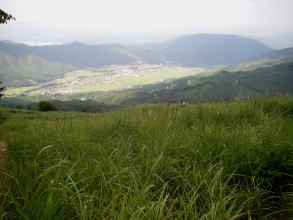 | 登山口から30分ほどでリフト終点に到着。振り返ればふもとの集落が見える。 |