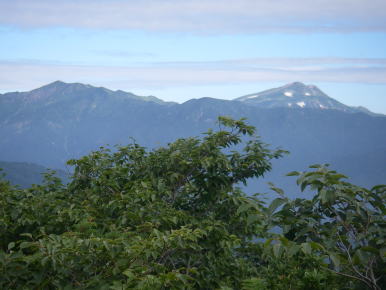 | 山頂では、曇っていてくっきり見えるとは行かなかったが、360度の展望が得られた。山岳展望盤もあり、名前を確認できるのがうれしい。 写真は雪が残っているのが見える白山 下山後、鷲ヶ岳に向かう。 |